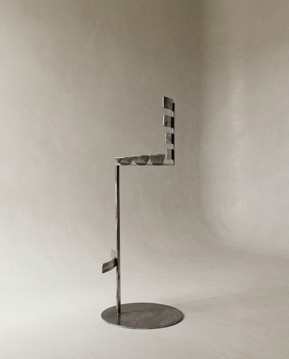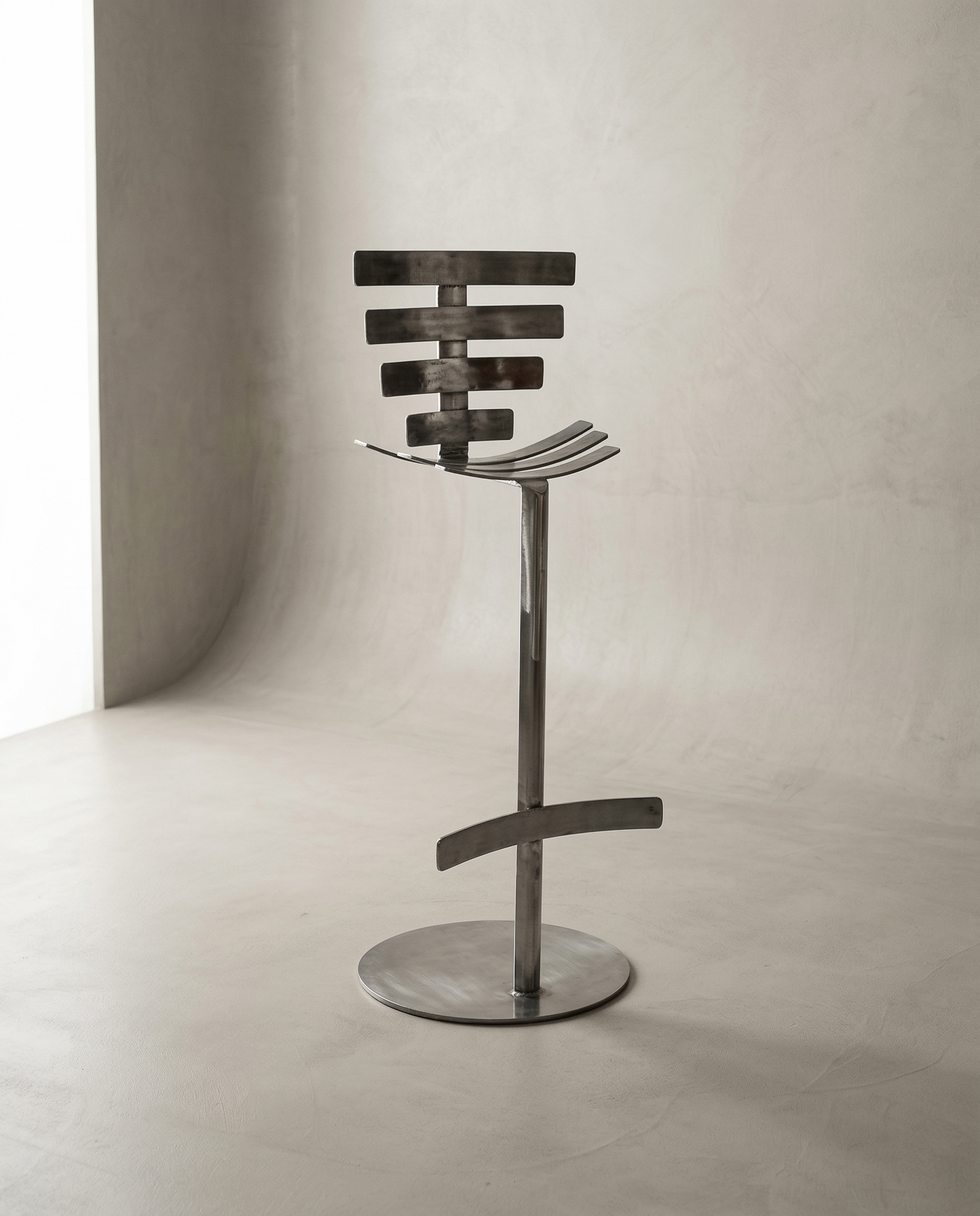 Entirely handcrafted in mild steel, the piece balances sculptural presence and structural clarity. Through a process of formal subtraction, the barstool reduces the body to its essential architectural elements, transforming anatomy into load-bearing geometry.
